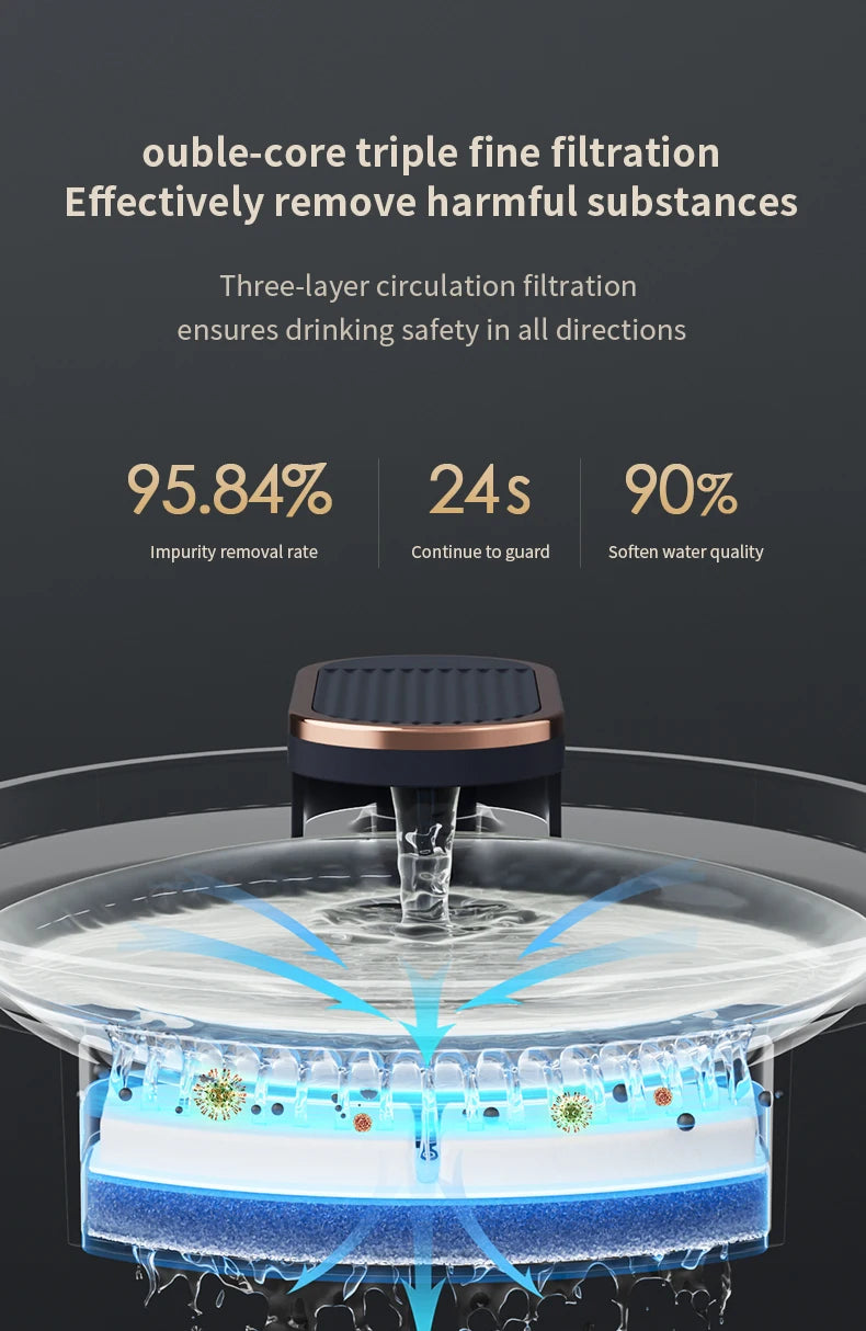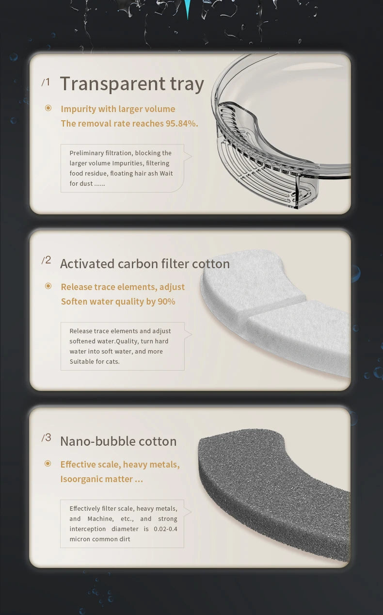 2. Advantages: mute, energy saving, prolong the service life of filter element and water pump, can better attract pets to drink more water.