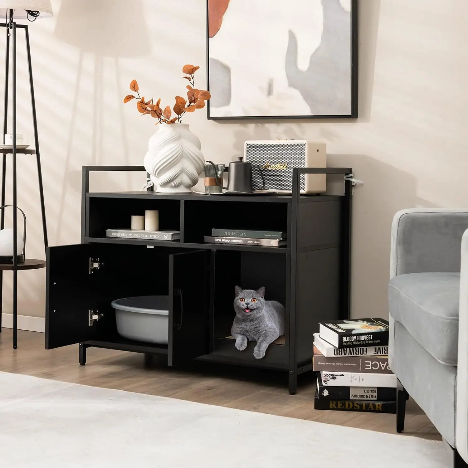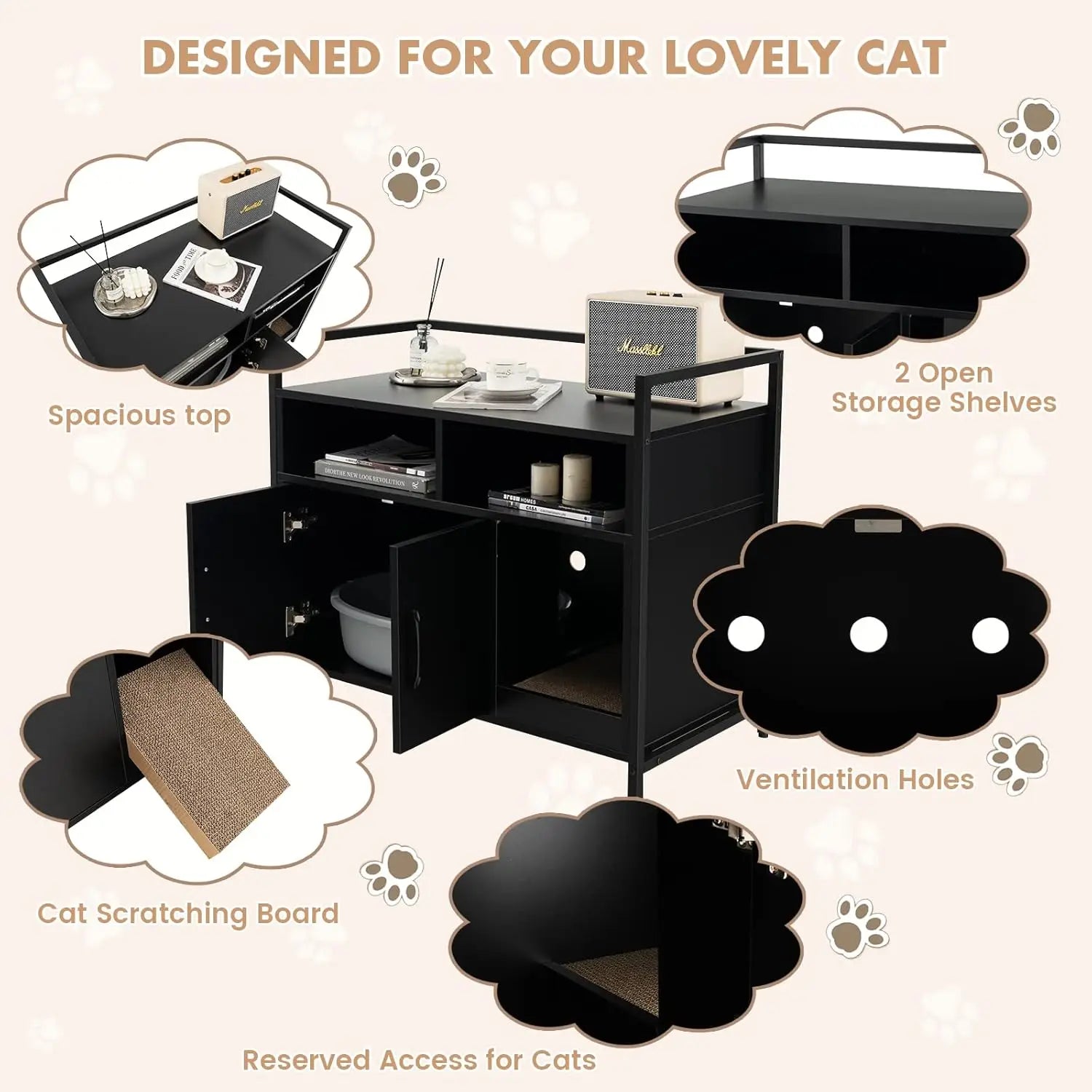 Cat Litter Box Enclosure Cat Washroom Hidden Furniture with Front Entry Cat Scratcher 2-Door Storage Cabinet 2 Compartments