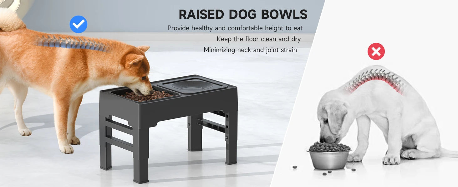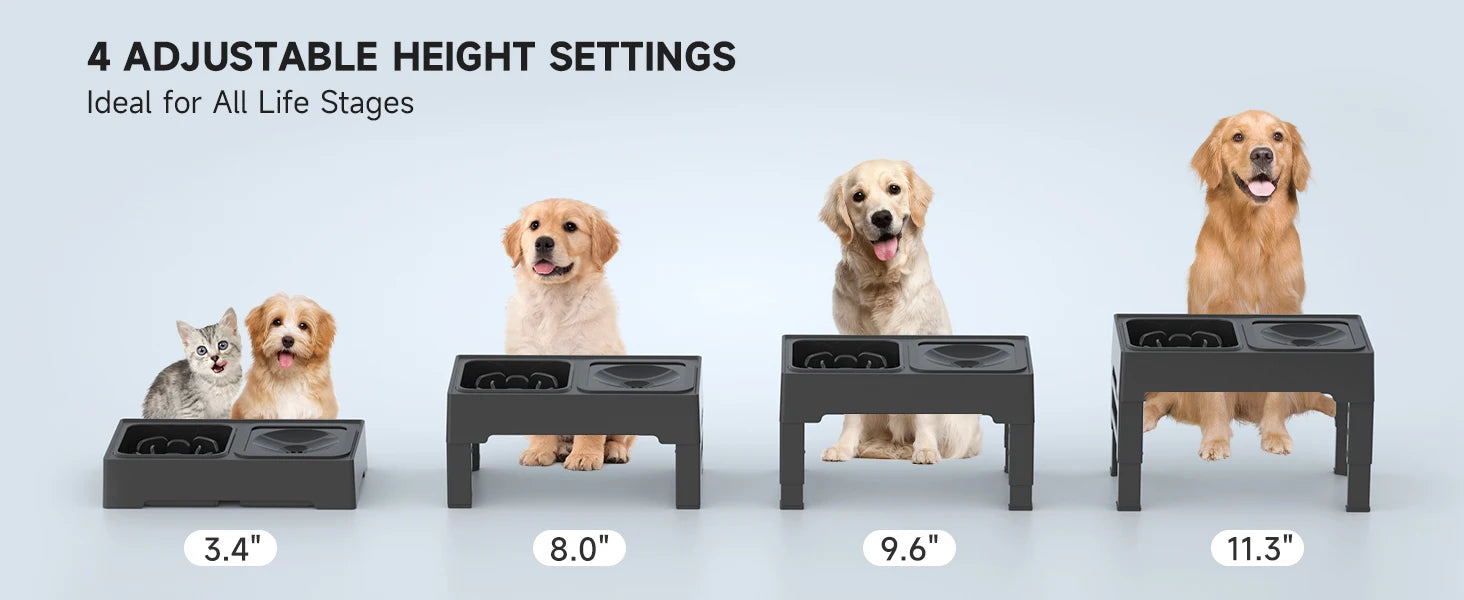 Adjustable Heights Ideal for All Life Stages: Elevated dog bowls for large dogs is well-designed with different heights to grow with your dog from puppyhood to adult years. The raised dog bowl can adjust to(3.4"-11.3") for large, medium, and small dogs & cats.This raised dog bowl effectively reduces stress on neck,joints and spine. And it also helps promote healthy digestion by providing comfortable height for access to food and water.