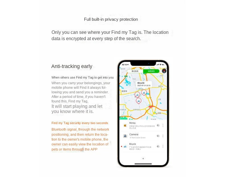 3. Global positioning function: The locator will send out a safe Bluetooth signal every two seconds, so that the surrounding Apple devices can detect and receive this signal and upload and share it to the Apple ICOUD server. The owner can know the location of Findmytag through the APP software. You can navigate to find items, so you can find them without worry