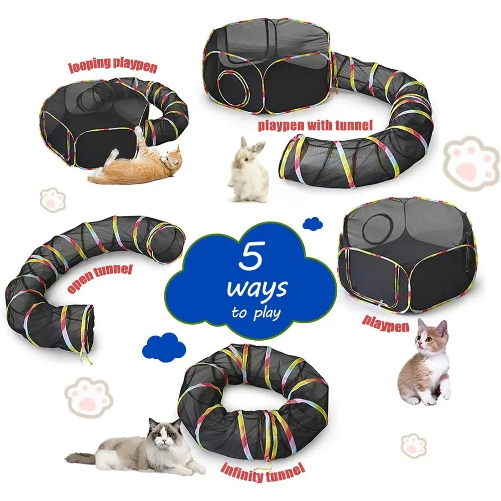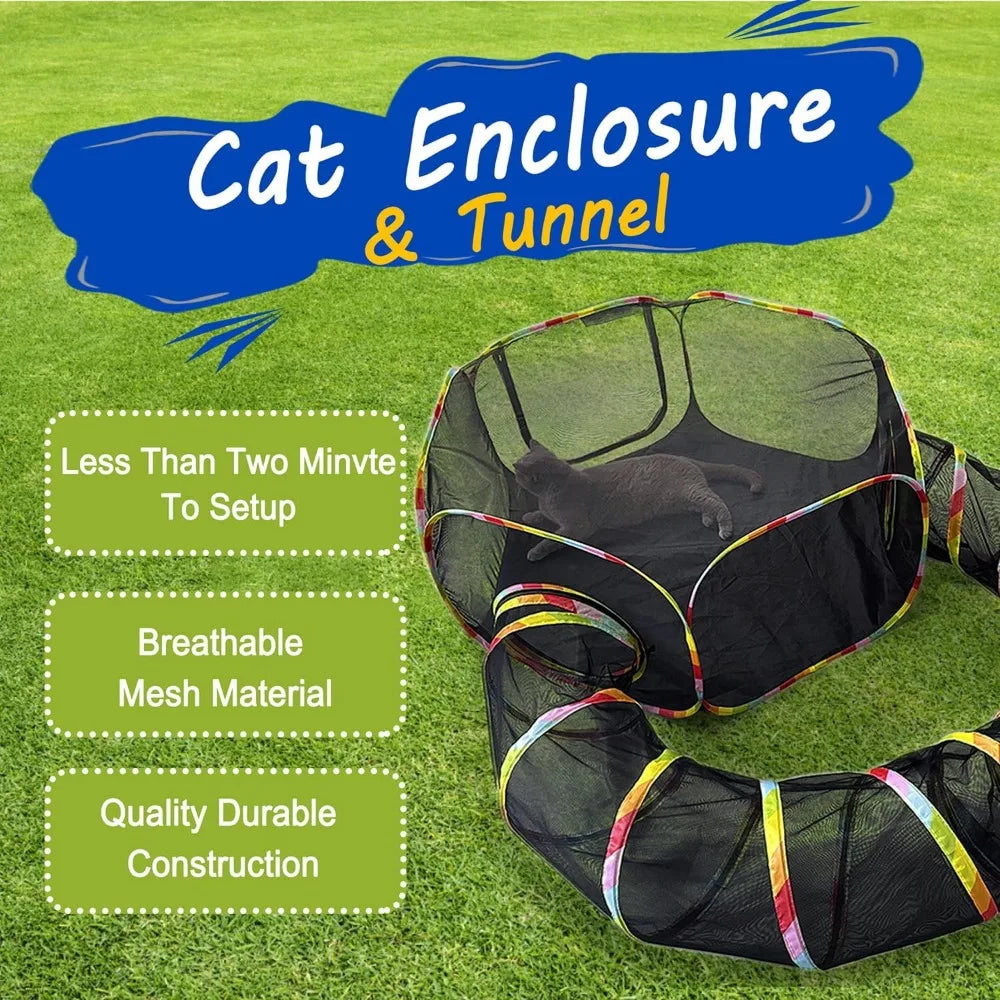 - Outdoor Cat Enclosures : Includes one cat tent, one cat tunnel. The cat tent with two big zipper doors, The cat tunnel can link to cat tent by zipper for cats to play. Cat tent and cat tunnel can be used together or separately.