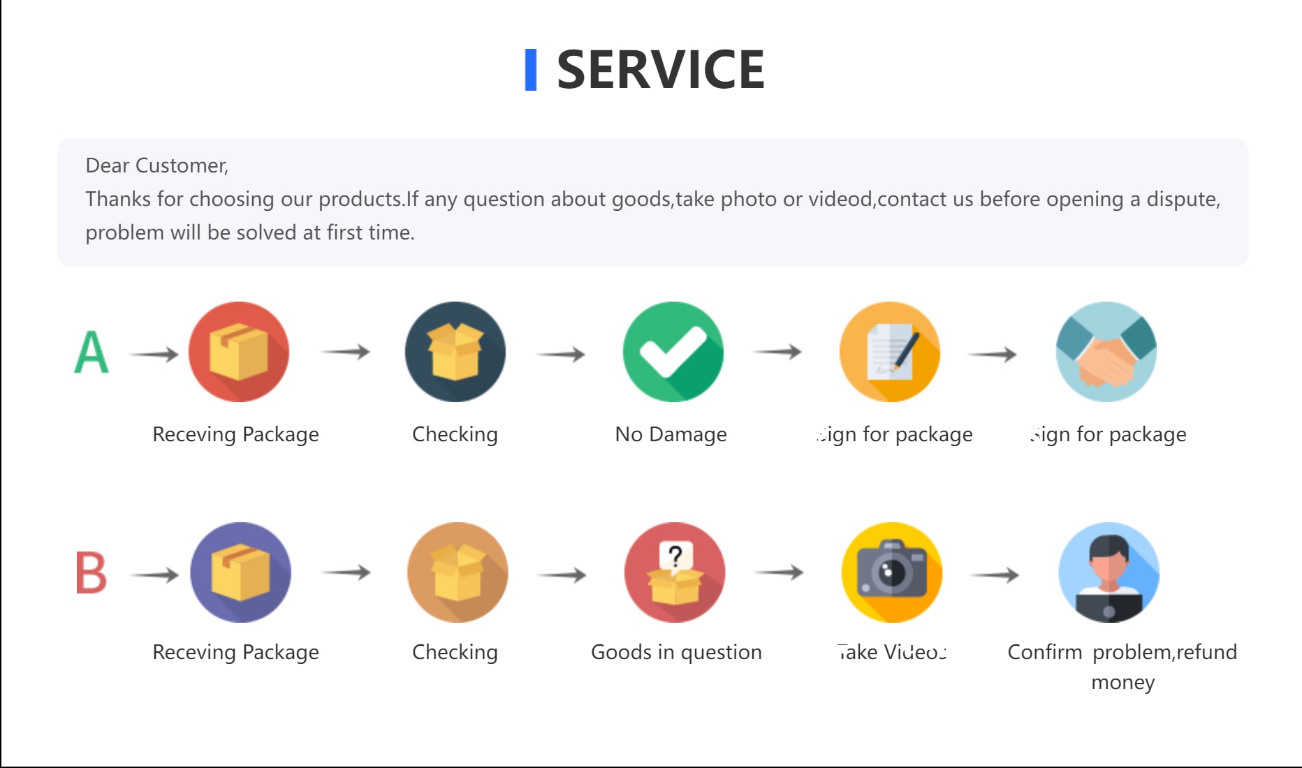 • If you encounter any situation, or any unsatisfactory situation, please do not open the dispute, please contact our customer service to explain the problem you have encountered, we will solve it.
